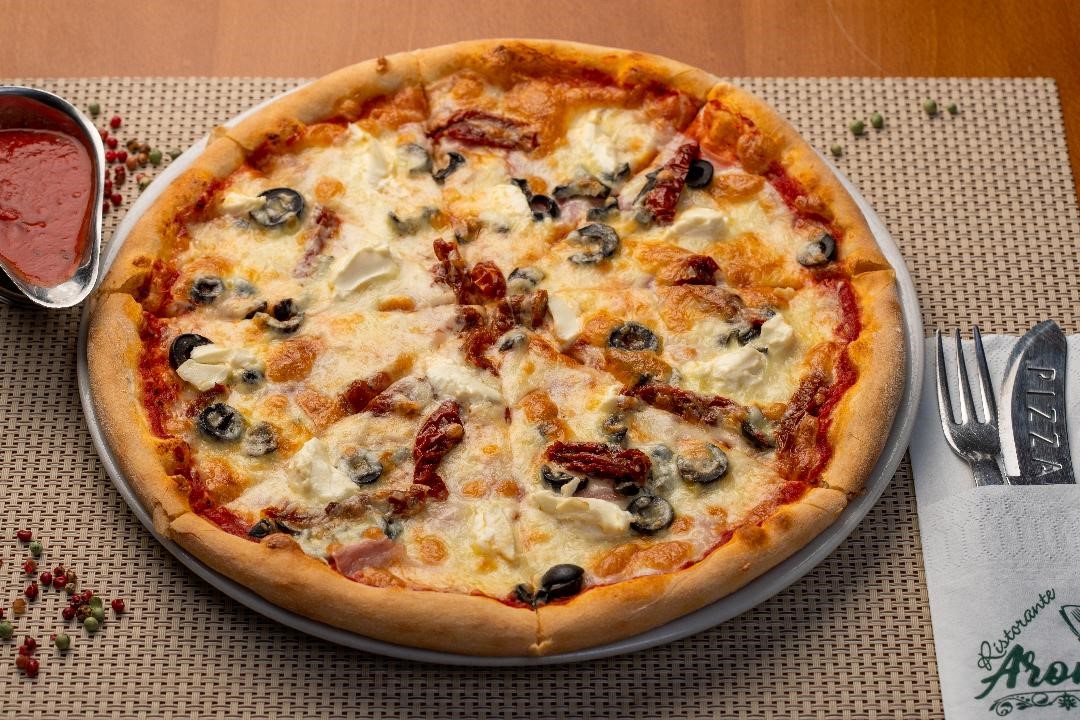 sos rosii,mozzarella,sunca,rosii uscate,masline,crema de branza/Tomato Sauce, Mozzarella, Ham, Sun-Dried Tomatoes, Olives, Cream Cheese